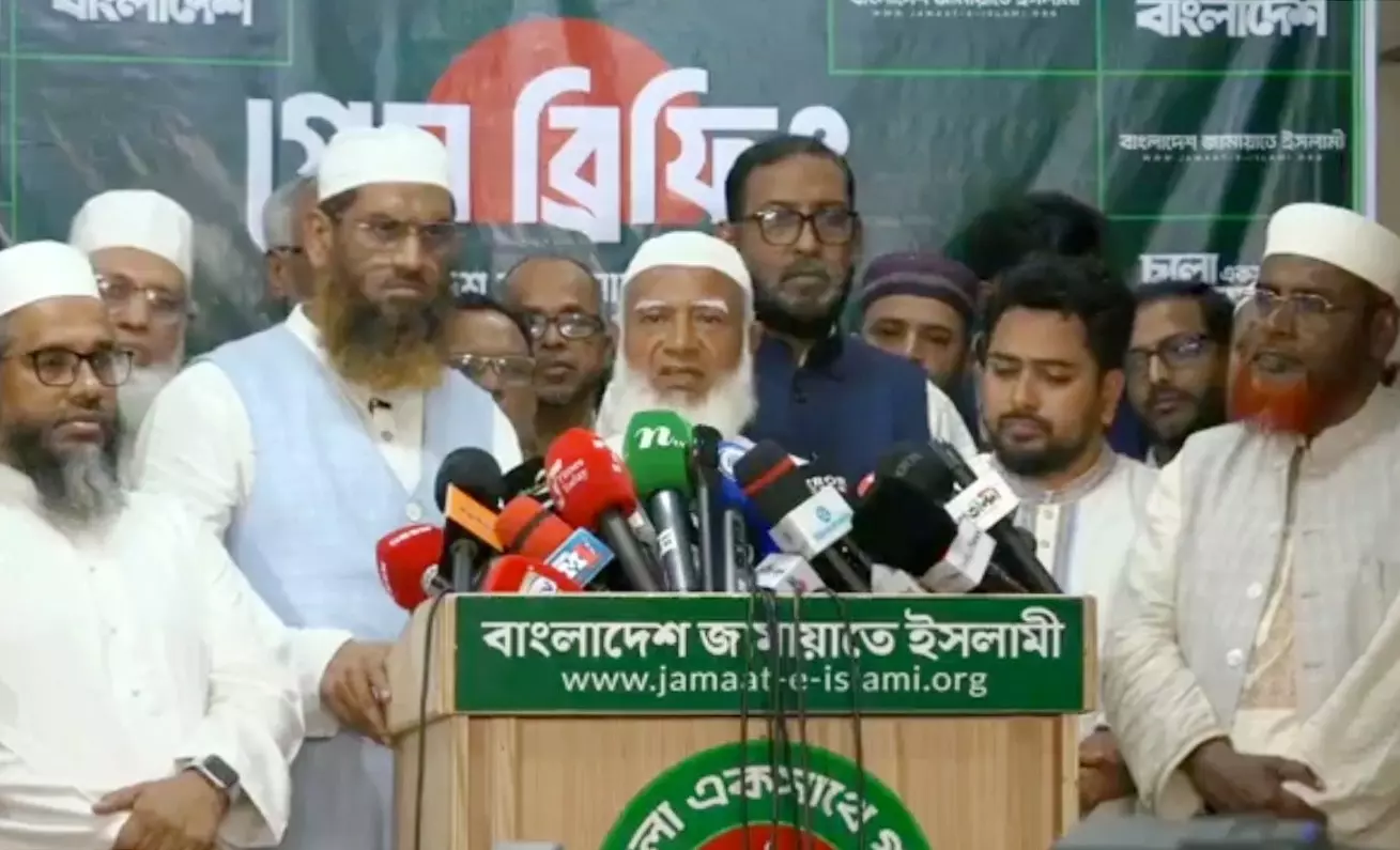 Bangladesh Jamaat-e-Islami chief Shafiqur Rahman addresses a press conference in Dhaka, Bangladesh, on February 14, 2026. Photo: PTI