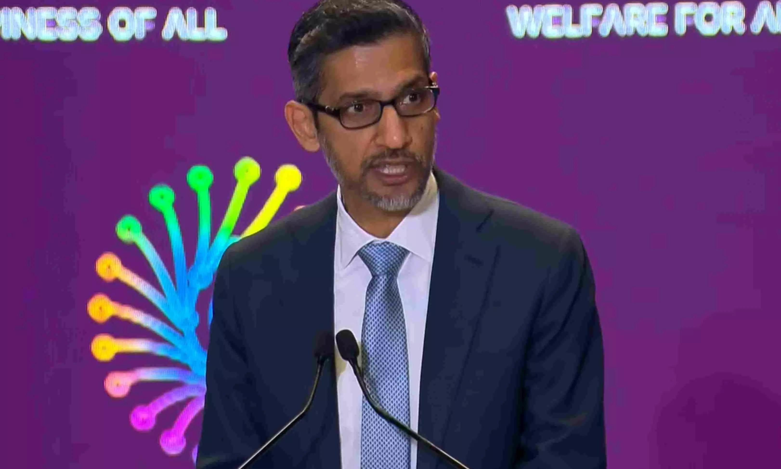 Google CEO Sundar Pichai addresses the gathering during the India AI Impact Summit 2026, in New Delhi. Photo: X |@NarendraModi/Yt via PTI