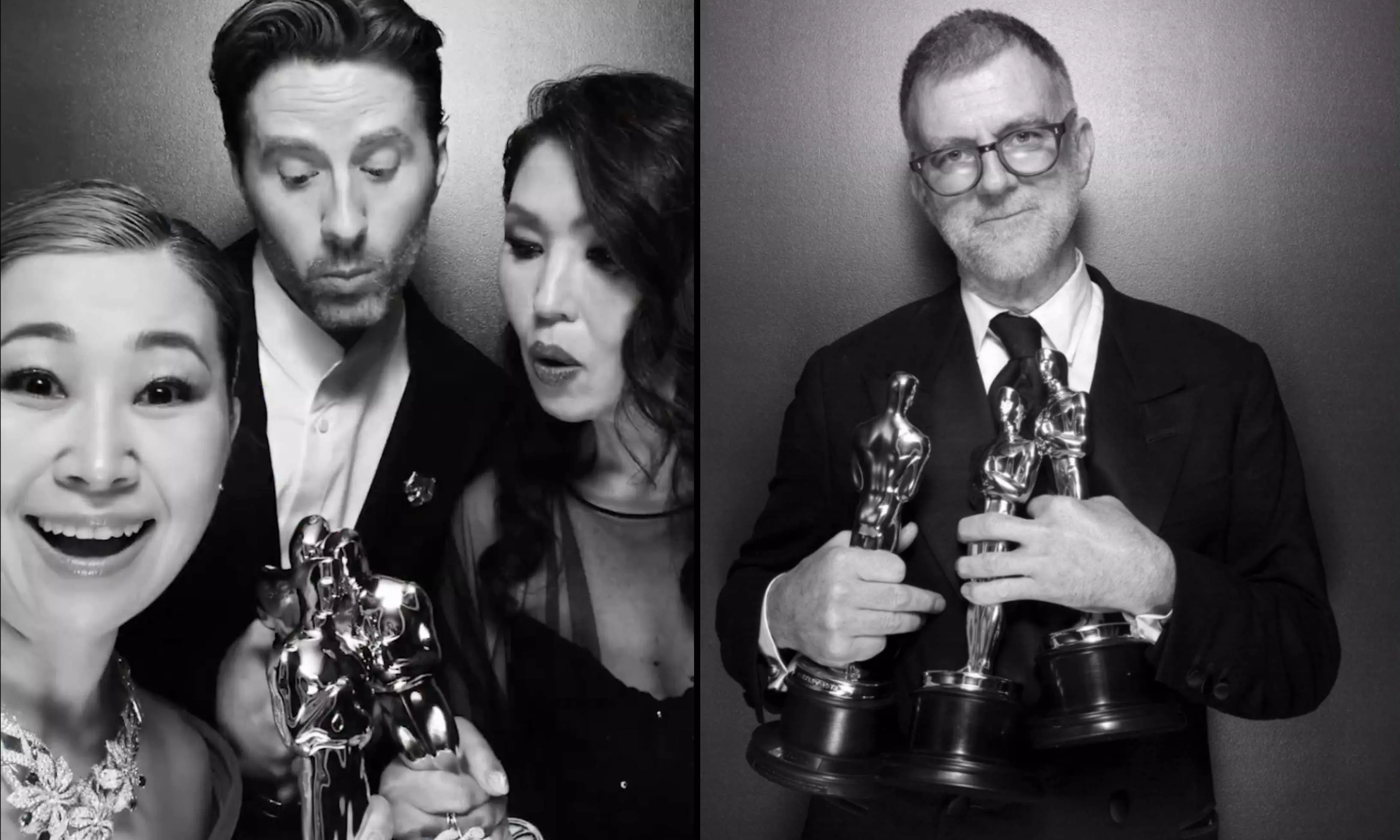History in their hands: Maggie Kang, Chris Appelhans and Michelle L.M. Wong celebrate Kpop Demon Hunters' historic wins. Right: The man of the night, Paul Thomas Anderson, 14 nominations later, with three Oscars to show for it. Photo: X/TheAcademy
