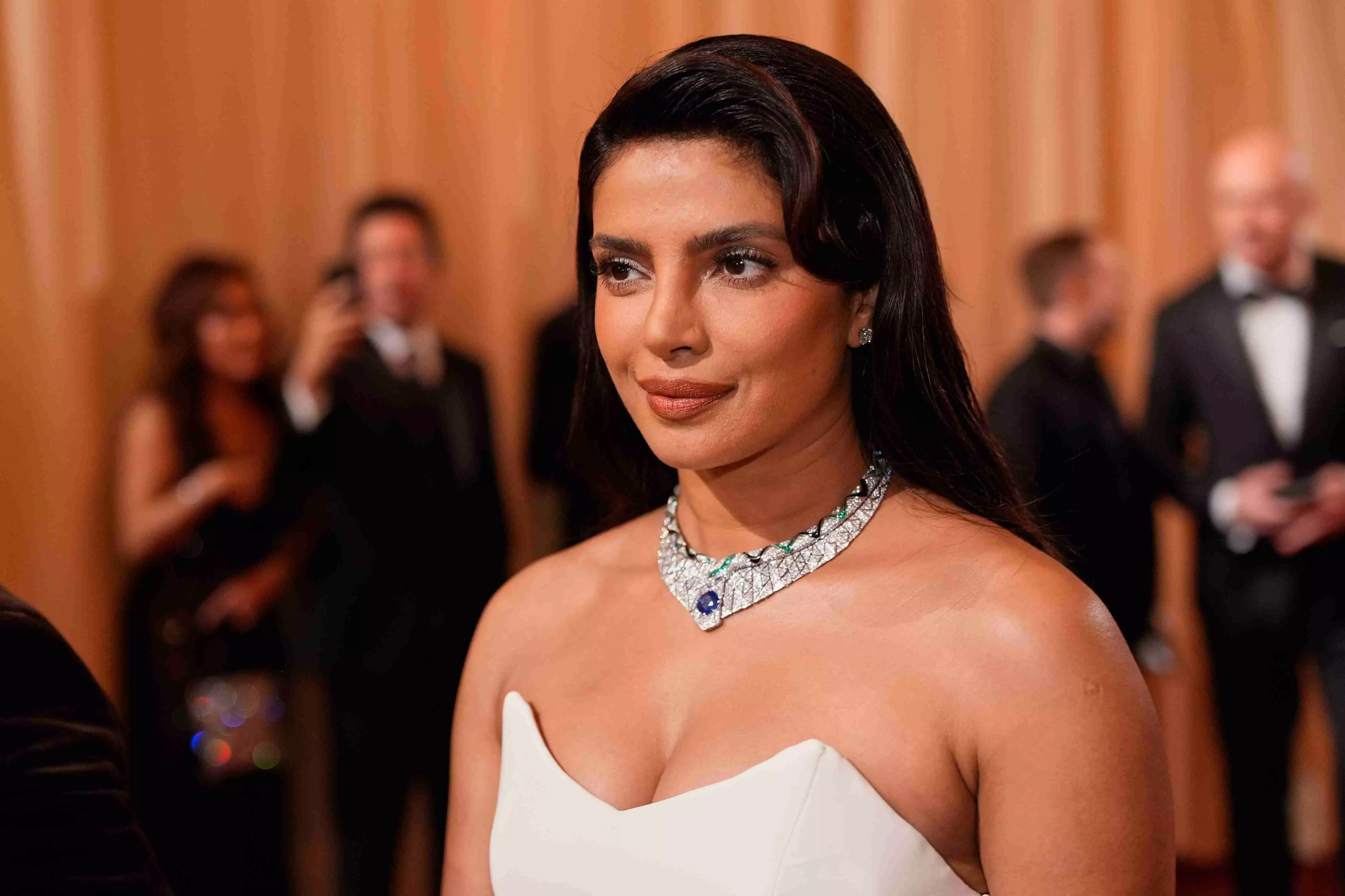 Oh, to be a fly on the wall as Priyanka Chopra (PC) prepared for the 98th Academy Awards at a plush Los Angeles hotel with her style team comprising hairstylist Bridget Brager and makeup artist Morgane Martini. There must have been a polite but albeit high-stakes tussle between the hair and makeup teams, we imagine, as fashion diktats command a sleek bun for a strapless Dior gown commandeered for PC for the evening. But it seems PC's thick, signature Indian tresses ultimately ruled the day, as she let them cascade over her shoulders, while sporting a stunning Bvlgari Eclettica sapphire necklace.
