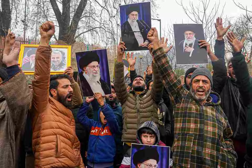 Agitators hold portraits of Iran's Supreme Leader Ayatollah Ali Khamenei during a pro-Iran march in Srinagar on Friday. PTI