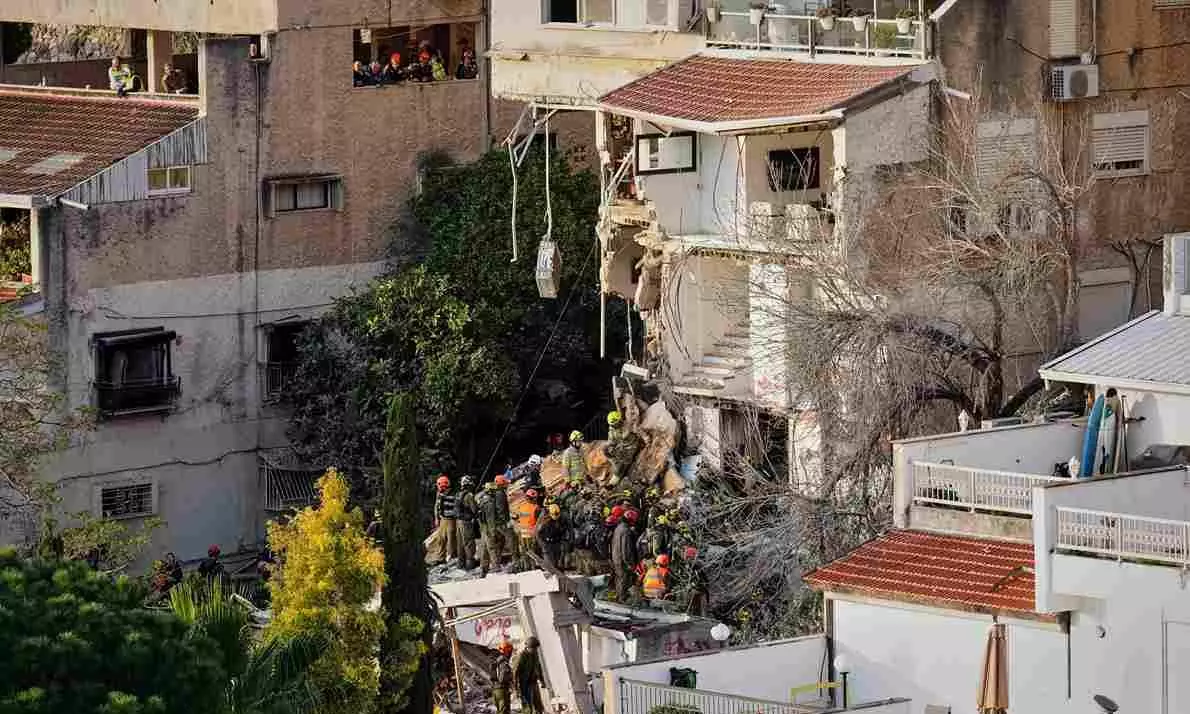 Israeli rescue teams search for missing people amid the rubble of a residential building a day after it was struck by an Iranian missile in Haifa, Israel, Monday, April 6, 2026. Photo: AP/PTI