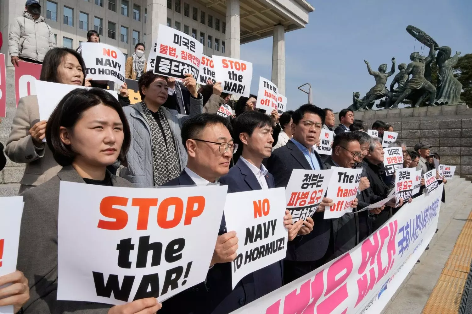 South Korean activists and lawmakers hold signs during a press conference denouncing the U.S. and Israel attacks on Iran outside the National Assembly in Seoul, South Korea, on Tuesday, March 24. AP/PTI