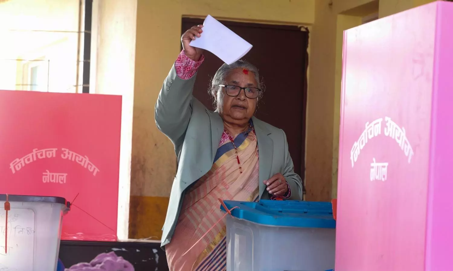 Nepal's Interim Prime Minister Sushila Karki casts her vote in Kathmandu, on Thursday, March 5. Photo: PTI
