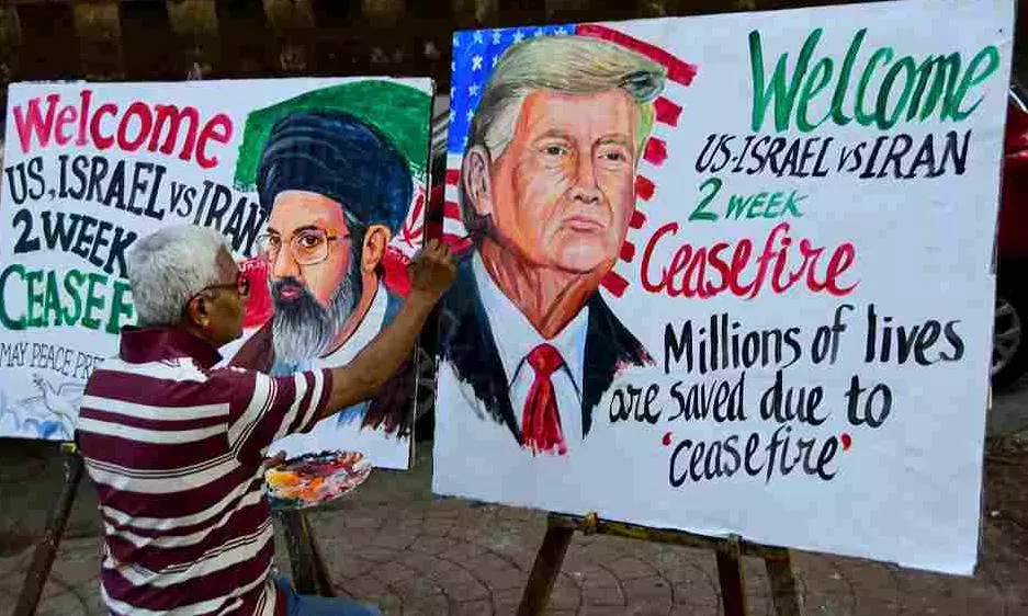 An artist paints posters depicting leaders and messages welcoming a two-week ceasefire amid the US-Iran conflict, in Mumbai, on April 8, 2026. Photo: PTI