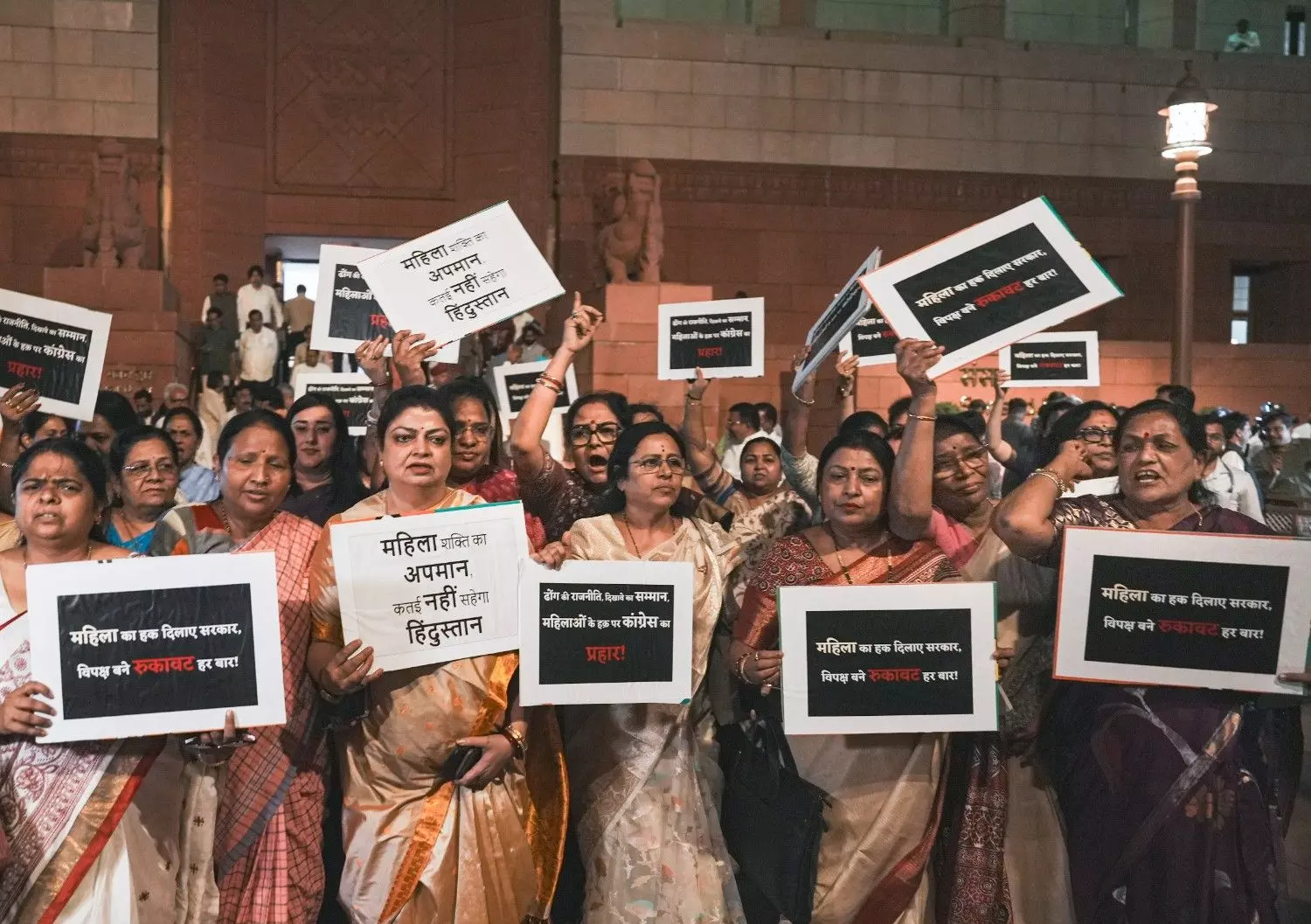 BJP MPs and others raise slogans during a protest, after the Constitution Amendment Bill to implement reservation for women, was defeated, in Parliament, on April 17, 2026. Photo: PTI
