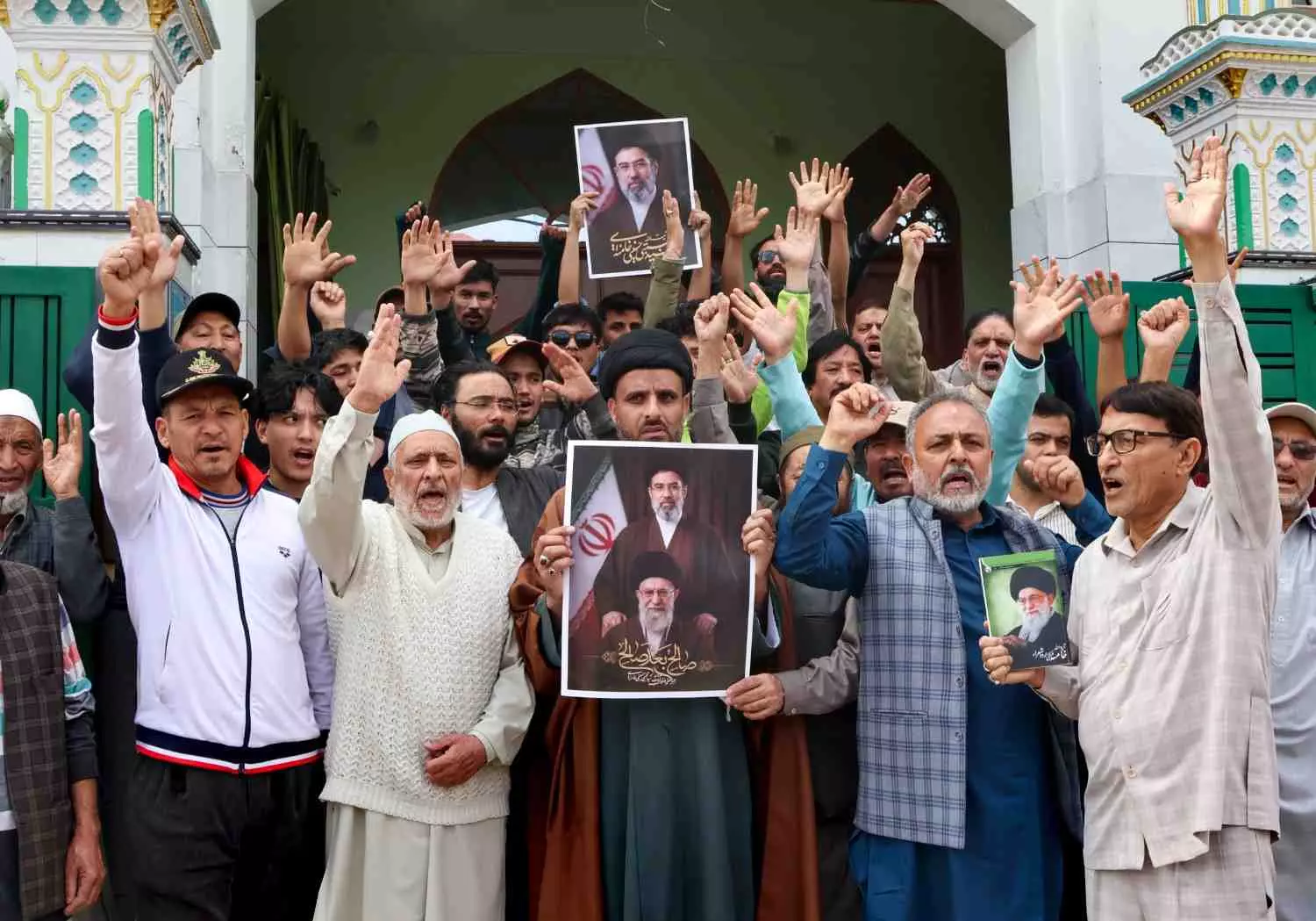 People raise slogans and hold portraits of the late Iran’s Supreme Leader Ayatollah Khamenei in Jammu after news of the ceasefire in Iran. Photo: AP/PTI