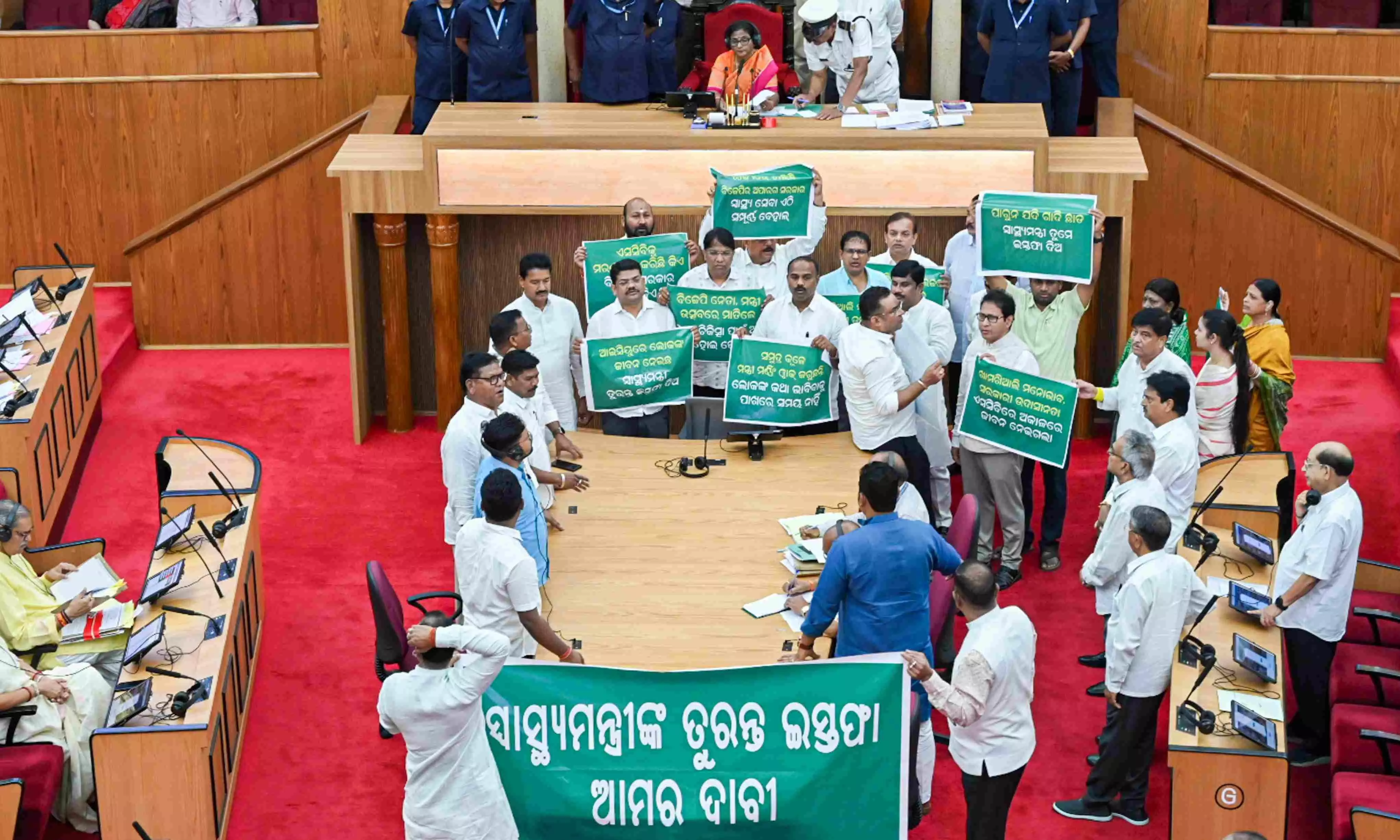 They carried a symbolic “body” wrapped with white cloth into the House and placed it on the reporters' table, and shouted slogans like 'Mohan Majhi hai hai'. Several MLAs displayed placards, demanding the resignation of the health minister.