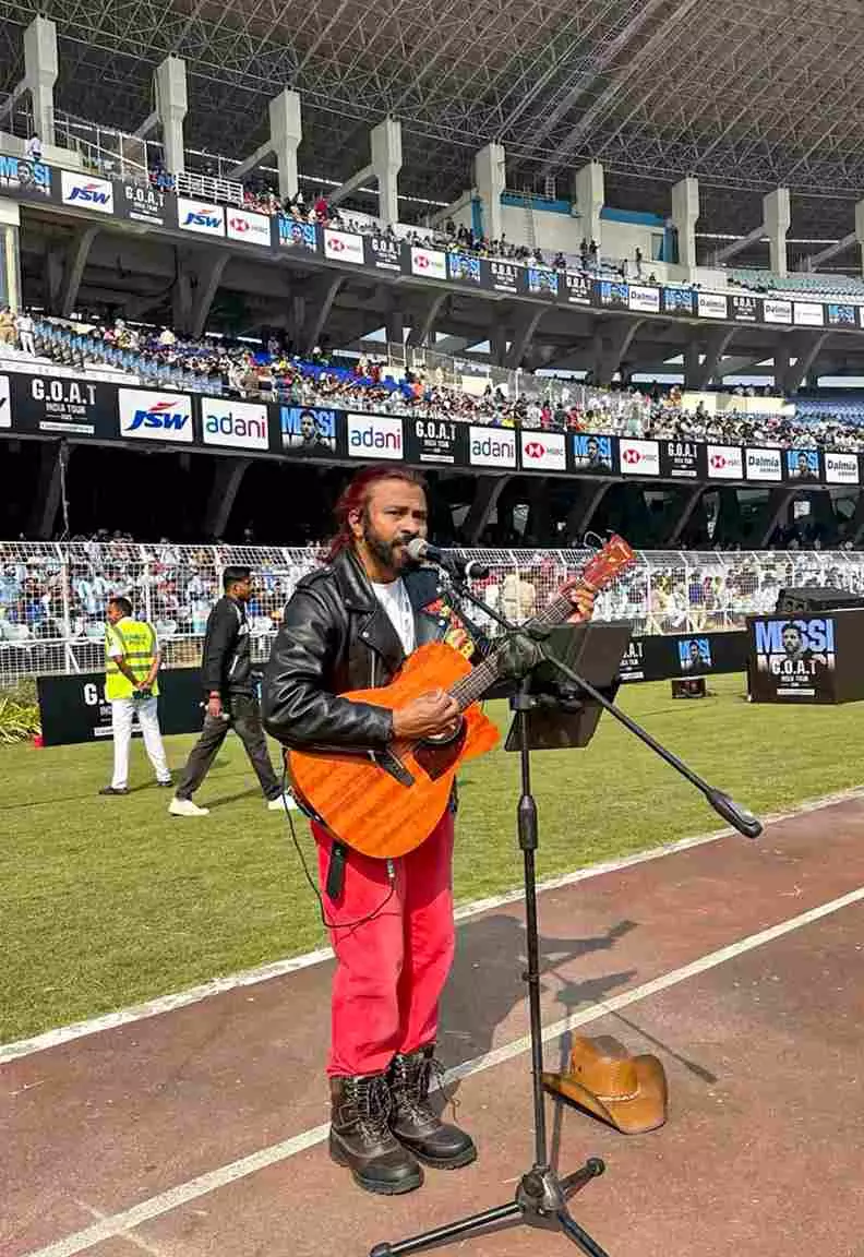 London-based Indian singer Charles Antony performs at Salt Lake Stadium during an event featuring football icon Lionel Messi, in Kolkata, Saturday, Dec. 13, 2025. Photo: PTI