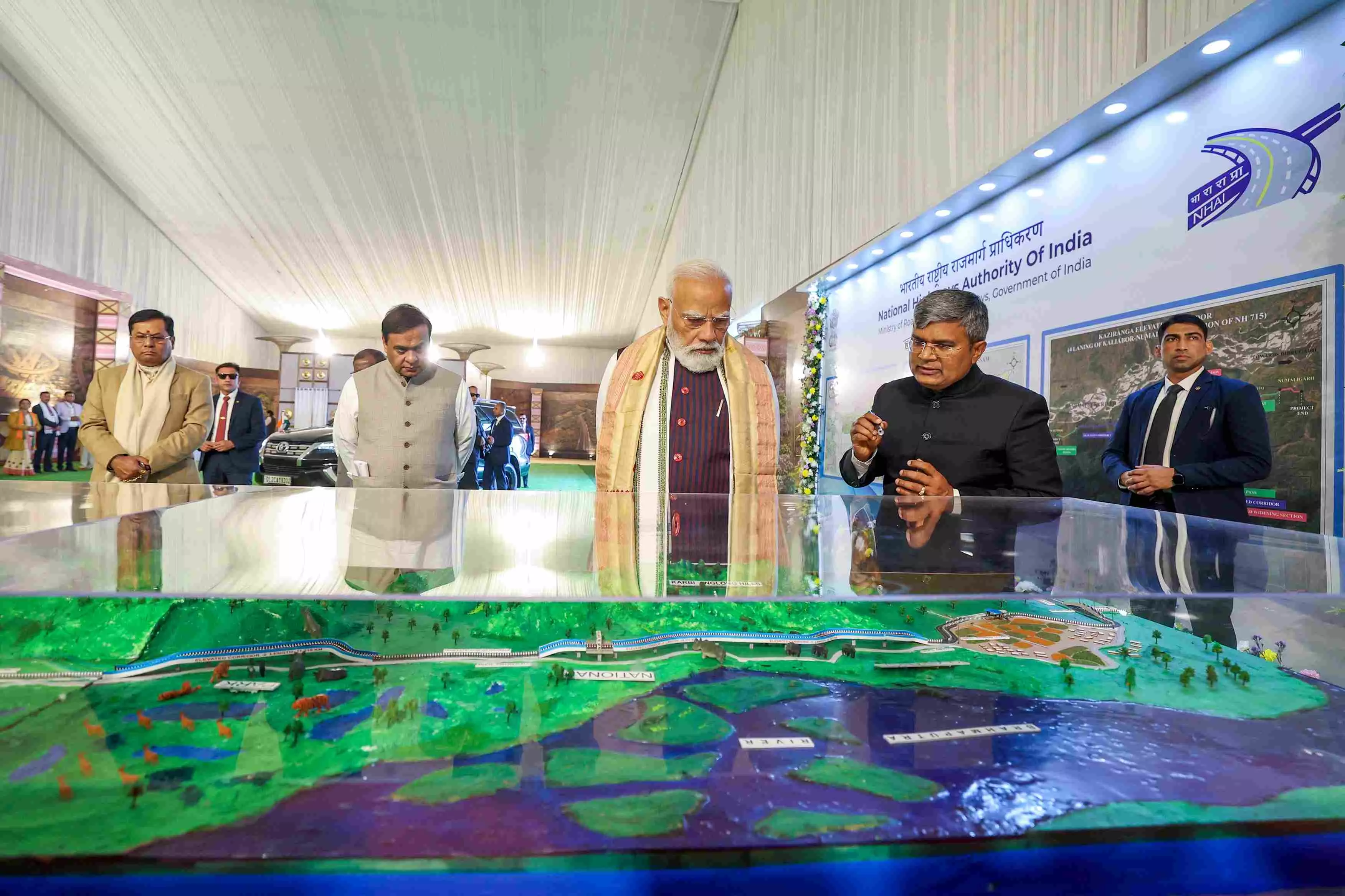 In this image received on Jan. 18, 2026, Prime Minister Narendra Modi looks at a model of Kaziranga Elevated Corridor during its foundation stone laying ceremony, in Nagaon district, Assam. Photo: PTI