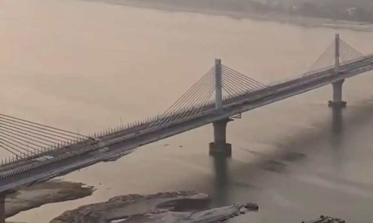 The 6-lane structure of Kumar Bhaskar Varma bridge over the Brahmaputra river is the first extradosed bridge in Northeast India. Photo: Screengrab/X/@himantabiswa