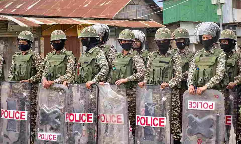 Police personnel stand guard after a protest broke out under the banner of Coordinating Committee on Manipur Integrity (COCOMI), following a bomb attack in Bishnupur on Tuesday, leaving two children dead, in Wangkhei area of Imphal, Manipur, Wednesday, April 8, 2026. Photo: PTI