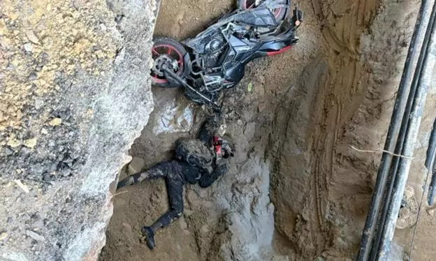Motorcyclist found dead beside his vehicle after plunging into a Delhi Jal Board excavation pit in Janakpuri, Delhi, in early February.