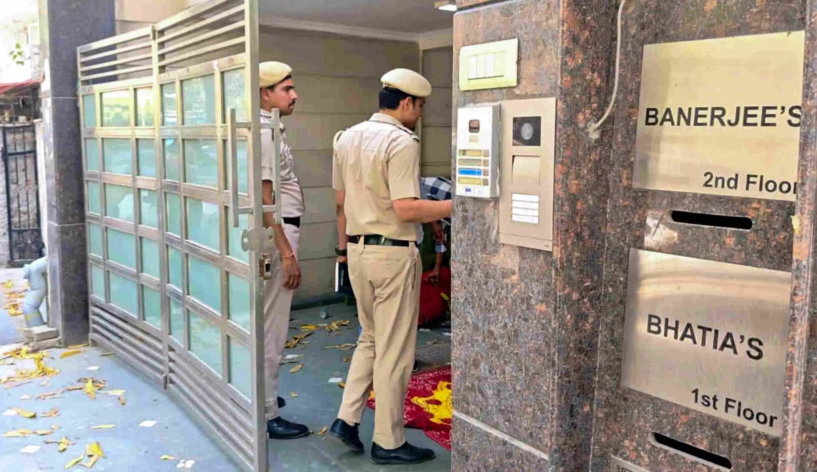 Police officials at the site after a woman, daughter of a senior IRS officer, was found murdered at her residence in southeast Delhi's Amar Colony area, on April 22, 2026. Photo: PTI