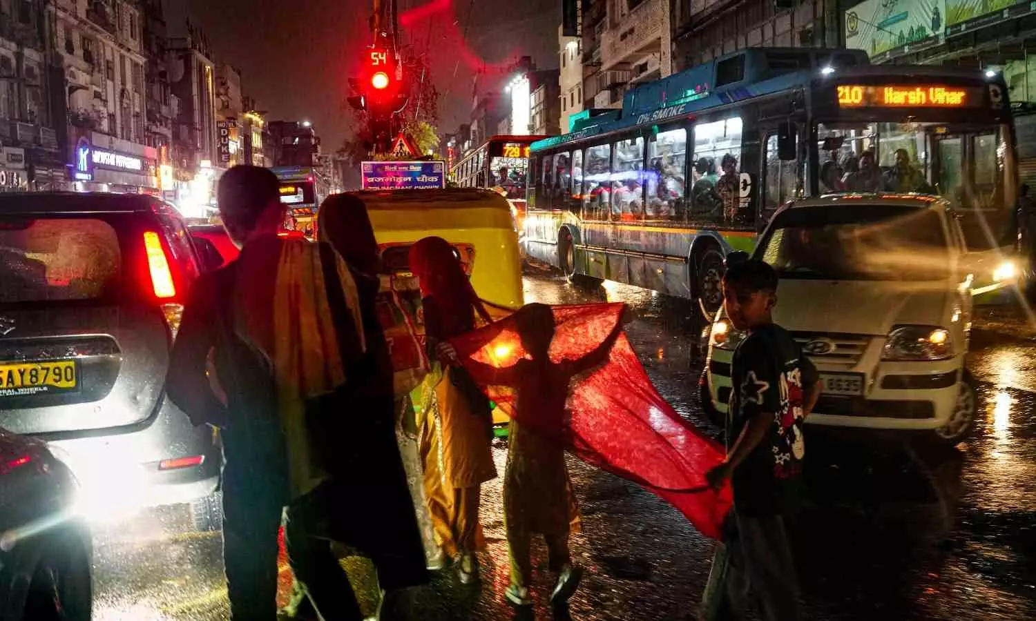 People cross a busy road using a cloth to shield themselves from the rain in Daryaganj, New Delhi on Wednesday (March 18). Photo: PTI