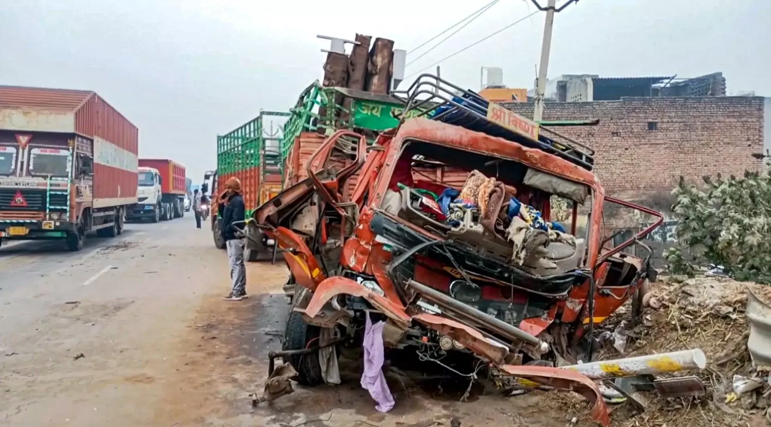 Wreckage of a vehicle at the site after a collision involving around six vehicles due to dense fog, on Gwalior highway, in Agra, Monday, January 5. PTI