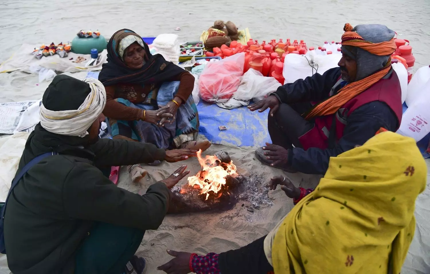 People sit around a makeshift fire to warm themselves amid dense fog in Prayagraj, Uttar Pradesh, on December 29, 2025, morning. Photo: PTI