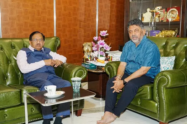 Karnataka home minister G Parameshwara seen here with Deputy Chief Minister DK Shivakumar at the latter's residence in Sadashivanagar in Bengaluru. Photo: X |@DrParameshwara