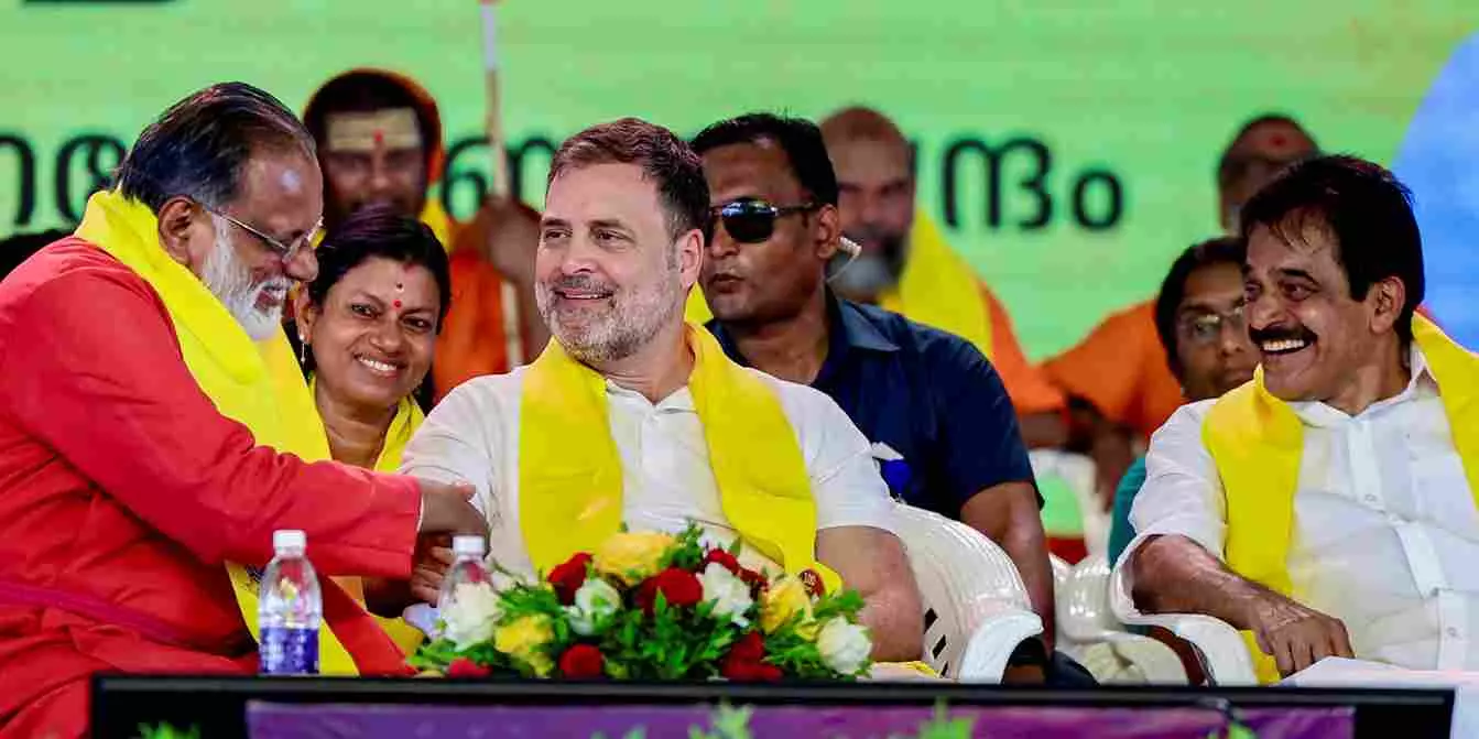 Leader of Opposition in the Lok Sabha and Congress MP Rahul Gandhi, centre, with party MP KC Venugopal, right, and others during an event commemorating the centenary of Mahatma Gandhi's meeting with reformist saint Sree Narayana Guru, in Kollam, Kerala. Photo: PTI