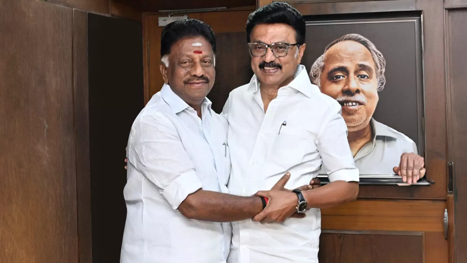 Stalin hugged Panneerselvam, shook hands, and pinned the party flag on him, marking a symbolic end to decades of rivalry between the two Dravidian majors.