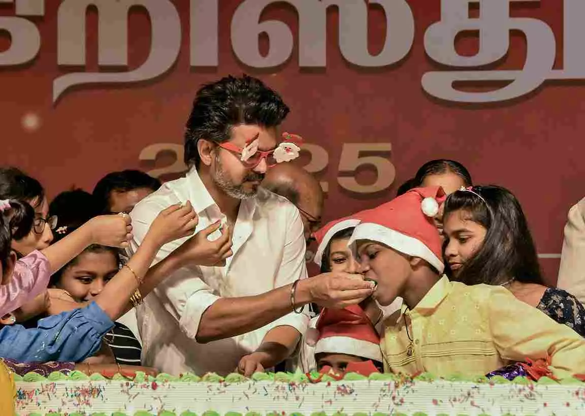 Tamilaga Vettri Kazhagam (TVK) chief Vijay cuts a Christmas cake with children during a recent 'Equality Christmas' celebration, in Mamallapuram, Tamil Nadu. File photo: PTI