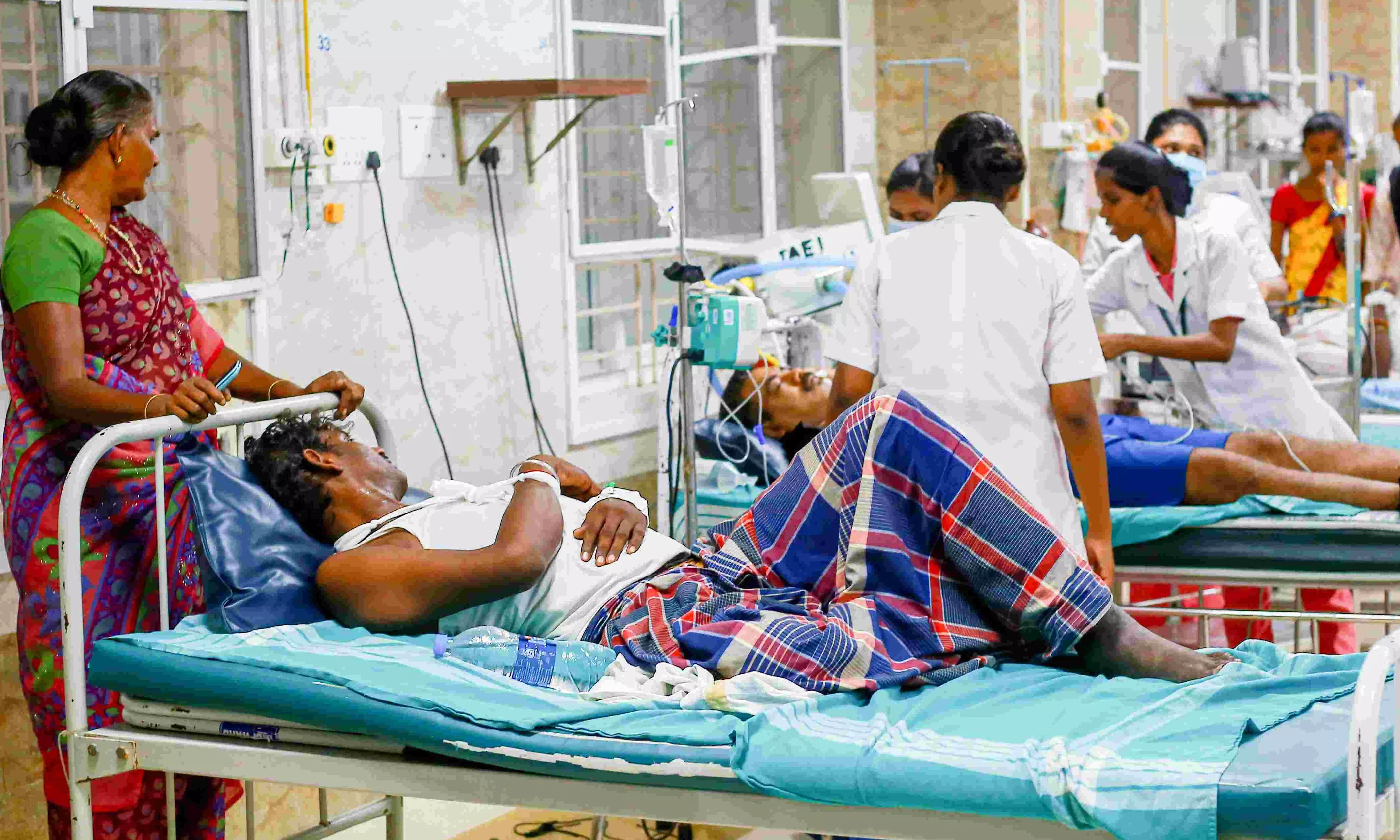 Injured receive medical treatment after sustaining injuries in a massive explosion at a private firecracker manufacturing unit, in Virudhunagar, Tamil Nadu. Photo: PTI