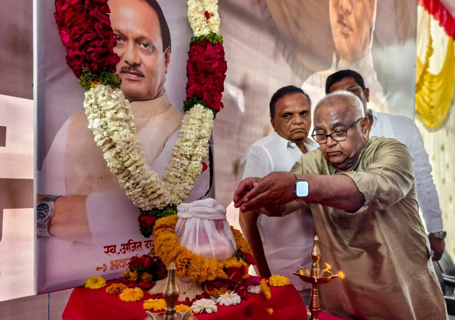 NCP leader Prakash Solanke pays tribute to the ashes of former Maharashtra deputy chief minister Ajit Pawar. Photo: X/@mahancpspeaks via PTI