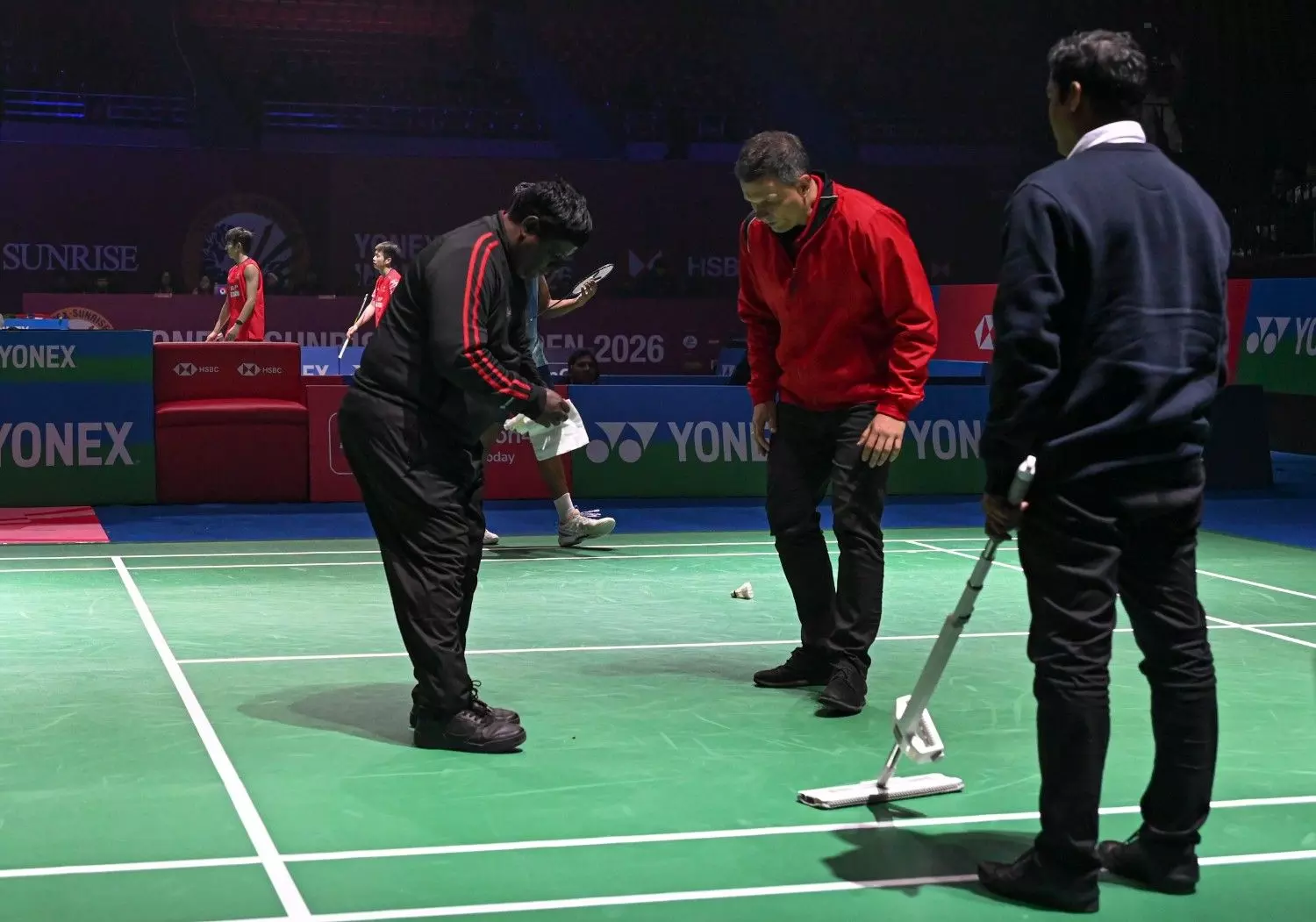 Maintenance staff clean 'bird droppings' during the men's singles round of 16 match between India's HS Prannoy and Singapore's Loh Kean Yew at the India Open 2026 badminton tournament, in New Delhi, in January. Photo: PTI