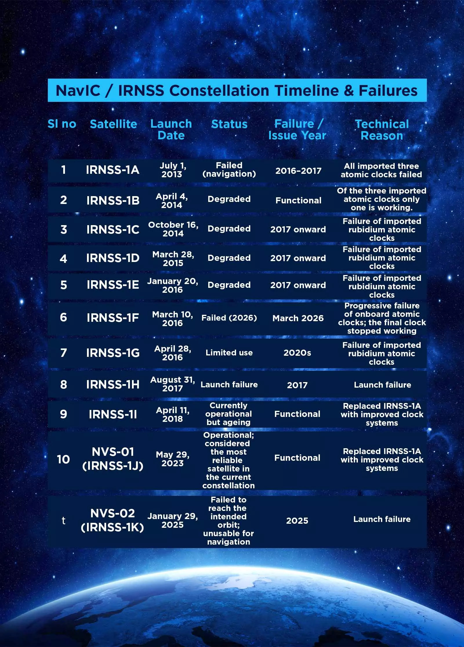 Then the troubles began. IRNSS-1A, 1C, 1D, 1E, 1G, and eventually 1F, clocks failed prematurely. In five of these satellites, all three clocks stopped working. In the others, one or two failed, shortening the satellite's useful life.