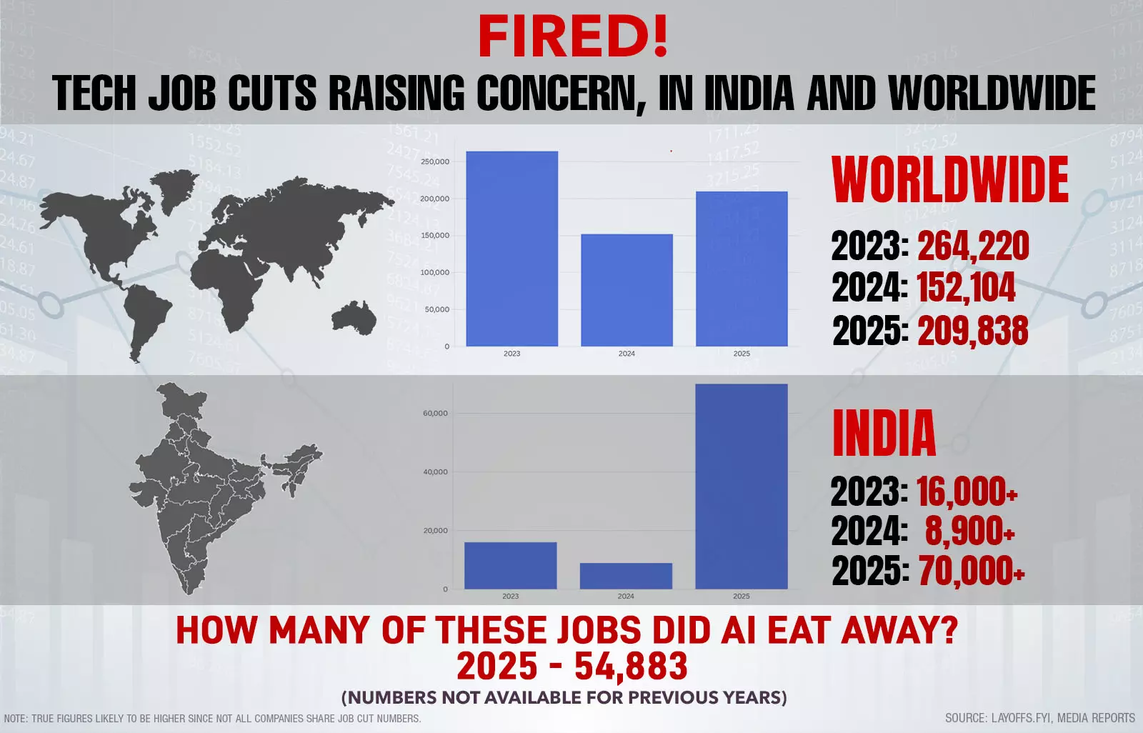 In this hour of extreme anxiety, Shreyas has plenty of company. Over 200,000 tech employees from over 700 companies were laid off in 2025 worldwide. Leading the bloodbath are some MAANG (Meta, Apple, Amazon, Netflix and Google) players and others, including Microsoft, IBM, Intel, HP, Salesforce and Cisco. And those are just the ones making headlines. All over the world, smaller firms and startups have been bulldozing tech jobs, blithely attributing it to artificial intelligence (AI).