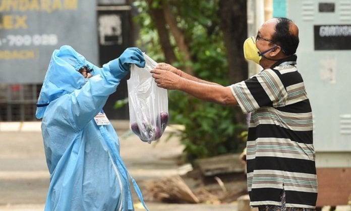 A health worker wearing a protective suit helps residents of a sealed area in Kolkata by providing essential food items | PTI Photo