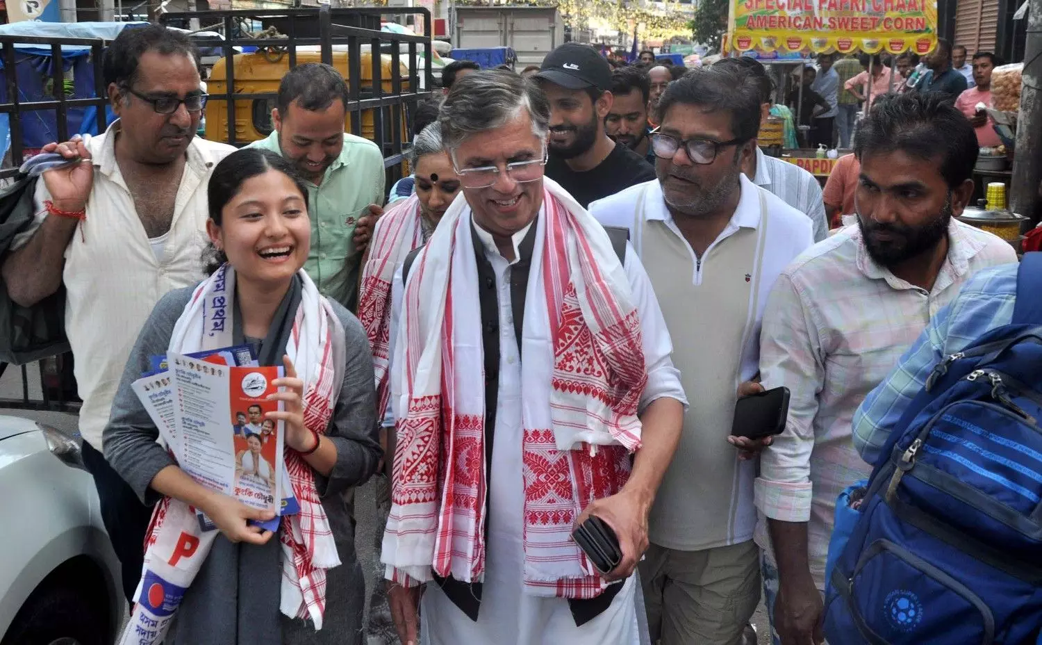 Assam Jatiya Parishad candidate Kunki Chowdhury (left) campaigns with Pawan Khera, a leader of the AJP's ally Congress, in Guwahati, ahead of Assam elections on April 9, 2026.