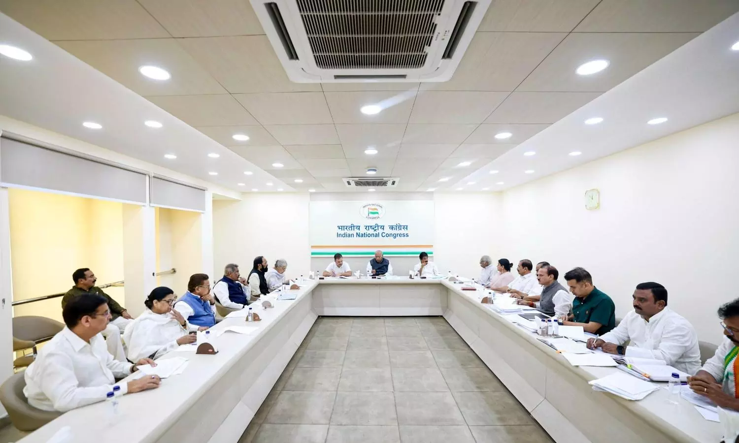 Congress President and LoP in the Rajya Sabha Mallikarjun Kharge, with LoP in the Lok Sabha Rahul Gandhi, party MP KC Venugopal, and others, during a Congress Central Election Committee (CEC) meeting for Kerala, in New Delhi, on Monday (March 17). (AICC via PTI Photo)