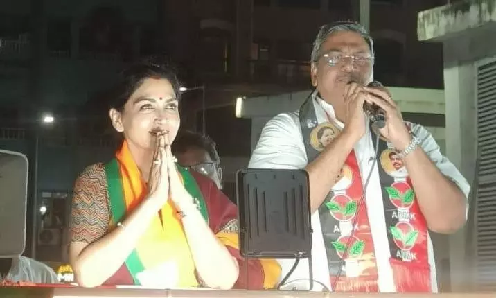 BJP leader Khushbu Sundar campaigning for the NDA in the Tamil Nadu assembly elections. Photo: X | @khushsundar