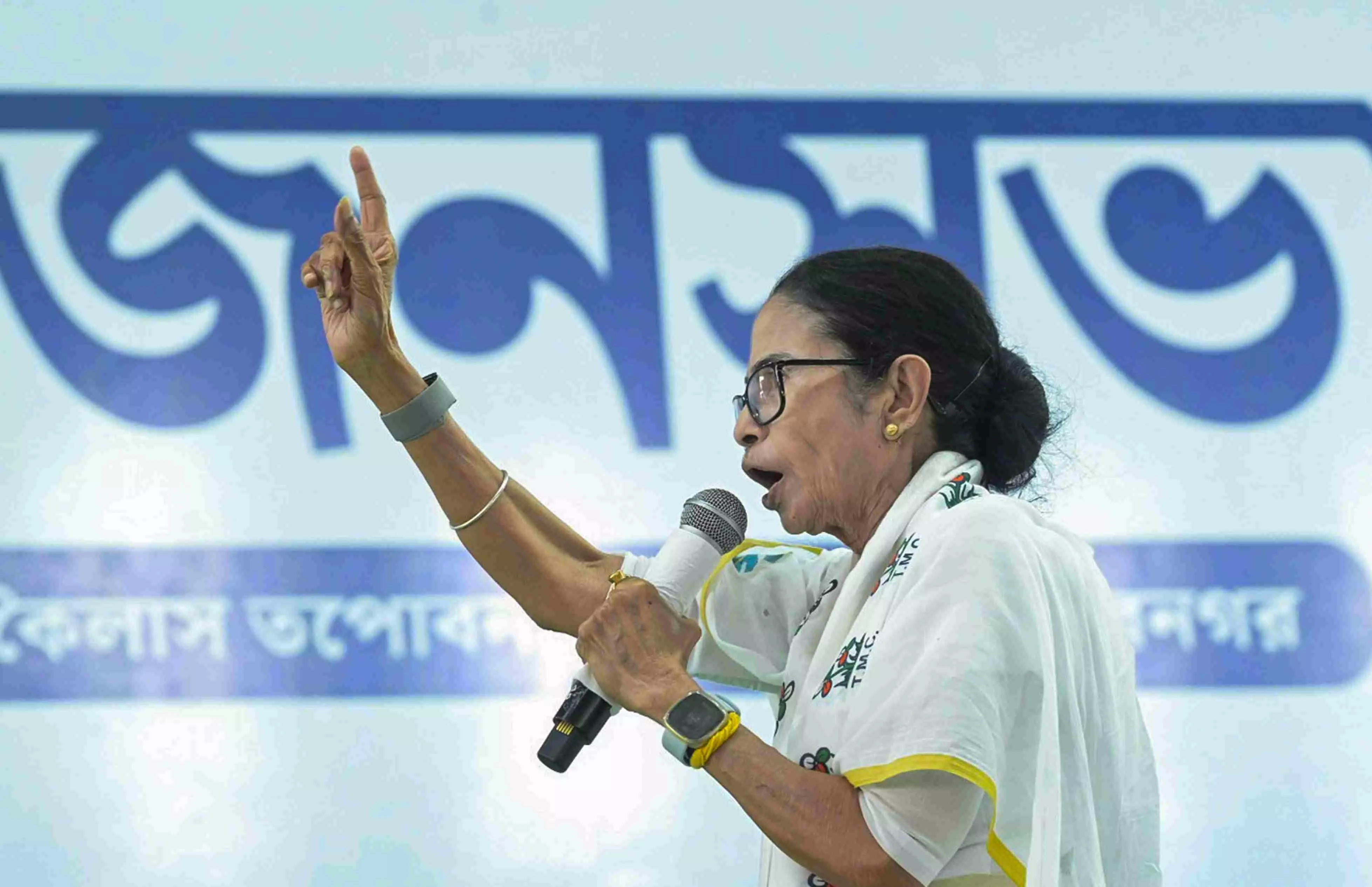 West Bengal Chief Minister Mamata Banerjee addresses a public rally in support of the party candidate for Baisnabnagar constituency, Chandana Sarkar, unseen, ahead of the state assembly elections, in Malda district. Photo: X|West Bengal CMO via PTI