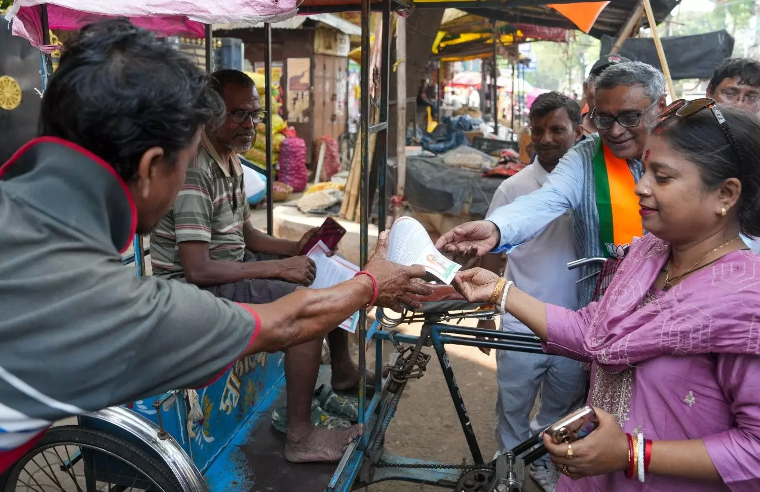 BJP candidate Swapan Dasgupta (wearing saffron scarf) campaigns for the Rashbehari Assembly constituency in Kolkata, West Bengal for the upcoming elections, on March 19, 2026. Photo: PTI