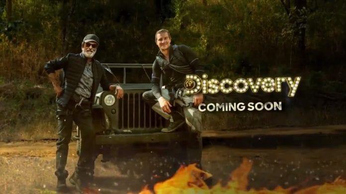 The 45-year-old adventurer shared the video on Twitter where he is seen posing in front of a jeep along with superstar Rajinikanth for the show.