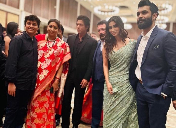 As always, Shah Rukh Khan looked dashing in an all-black formal attire as he posed for pictures with Smriti Irani, Mouni Roy, and her husband Suraj Nambiar.