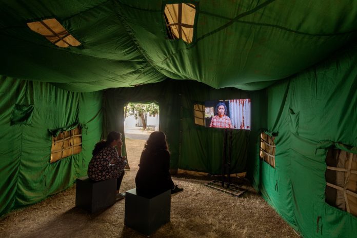 This edition of the biennale welcomes us with a sizable khaki tent, ‘Embassy,’ by the Australian aboriginal artist Richard Bell in the middle courtyard of the Aspinwall house. It’s erected as a tribute to Aboriginal tent embassy, which was first set up in 1972 in Canberra to denounce the McMahon Liberal government’s denial of Aboriginal land rights in Australia. Bell’s ‘Embassy’ was pitched during the 2016 Sydney biennale and the Venice biennale in 2019, where he staged a protest after being rejected to enrol as Australia’s official artist. Inside the hall we have his magnificently coloured and sloganized canvases with politically overt black and white letters in artistic red background, reading ‘DON’T EAT CAKE, EAT THE RICH’ and another one with “White Privilege is Affirmative Action for White People.”