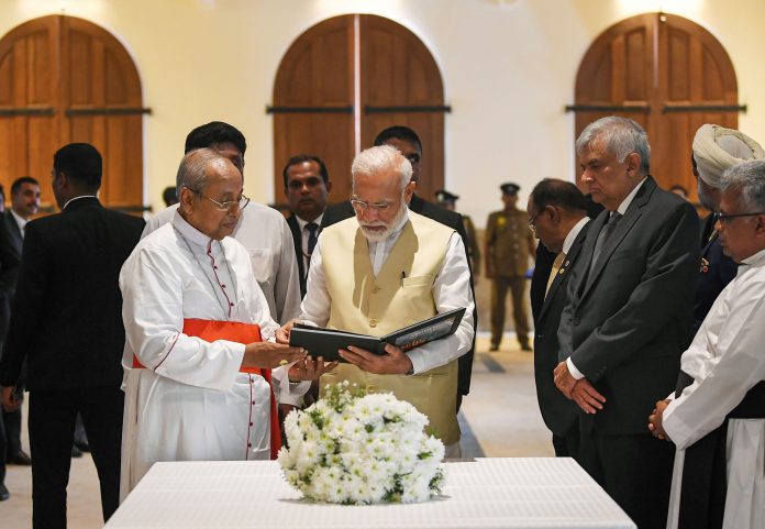 Earlier, Prime Minister Modis entourage made a detour to St Anthony’s church — one of the sites of the horrific Easter Sunday attacks — on their way from airport to the Presidential Secretariat, where a red carpet welcome awaited.