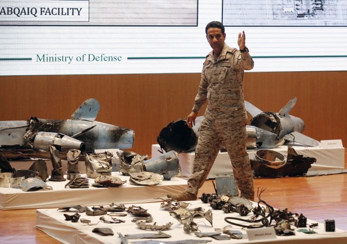 The Arab kingdom’s defence ministry displayed wreckage of drones and cruise missiles and said 18 drones and seven cruise missiles were fired at the Abqaiq and Khurais oilfields, of which three had fallen short of target.