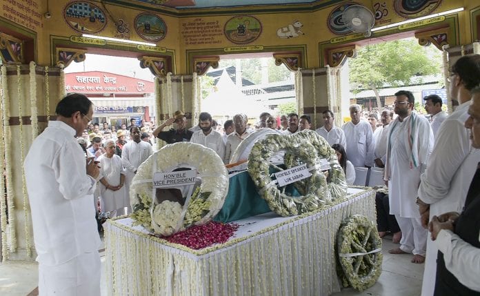 Earlier in the morning, the mortal remains of the veteran BJP leader was brought to the party headquarters where Union ministers Amit Shah, Rajnath Singh, and senior party leaders and workers paid their last respect.