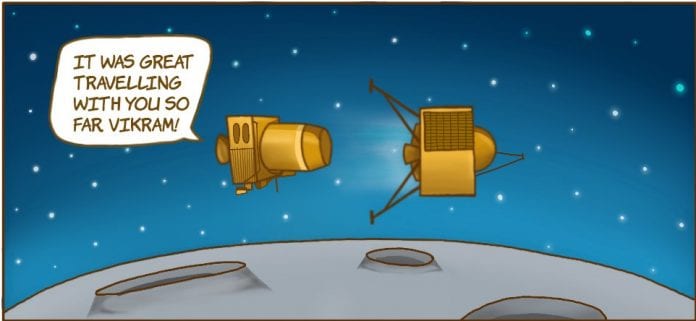 In the cartoon, the Lunar Orbiter while releasing Lander Vikram, says, “It was great travelling with you so far Vikram. Best of luck! I hope you reach the South Pole soon.” To this Vikram replies, “It was quite the journey indeed! I’ll see you around – in the orbit.”