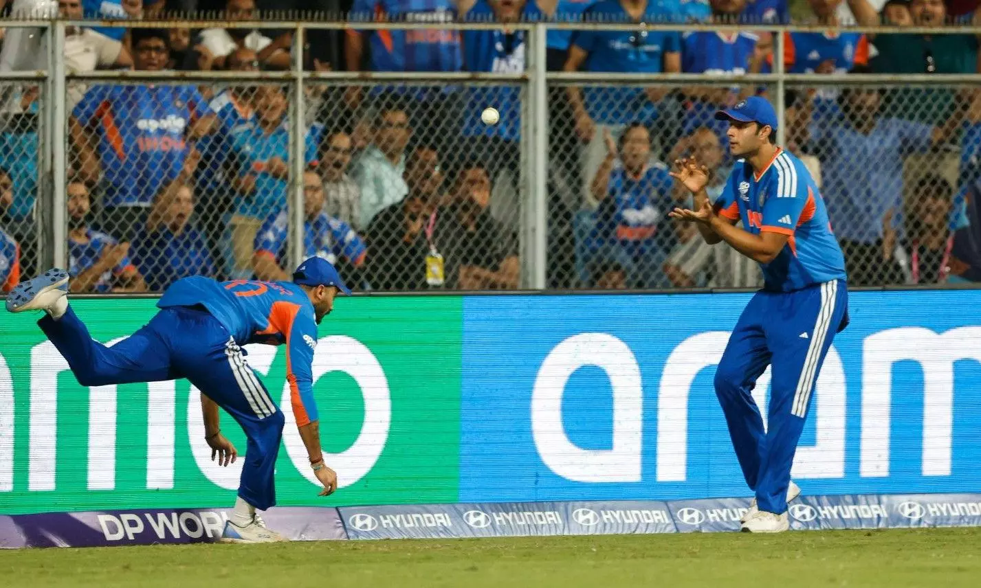 Axar Patel (left) catches the ball before relaying it to Shivam Dube as he crossed the ropes during India vs England semi-final in the T20 World Cup in Mumbai on Thursday (March 5). Axar-Dube combination dismissed Will Jacks. Photo: BCCI