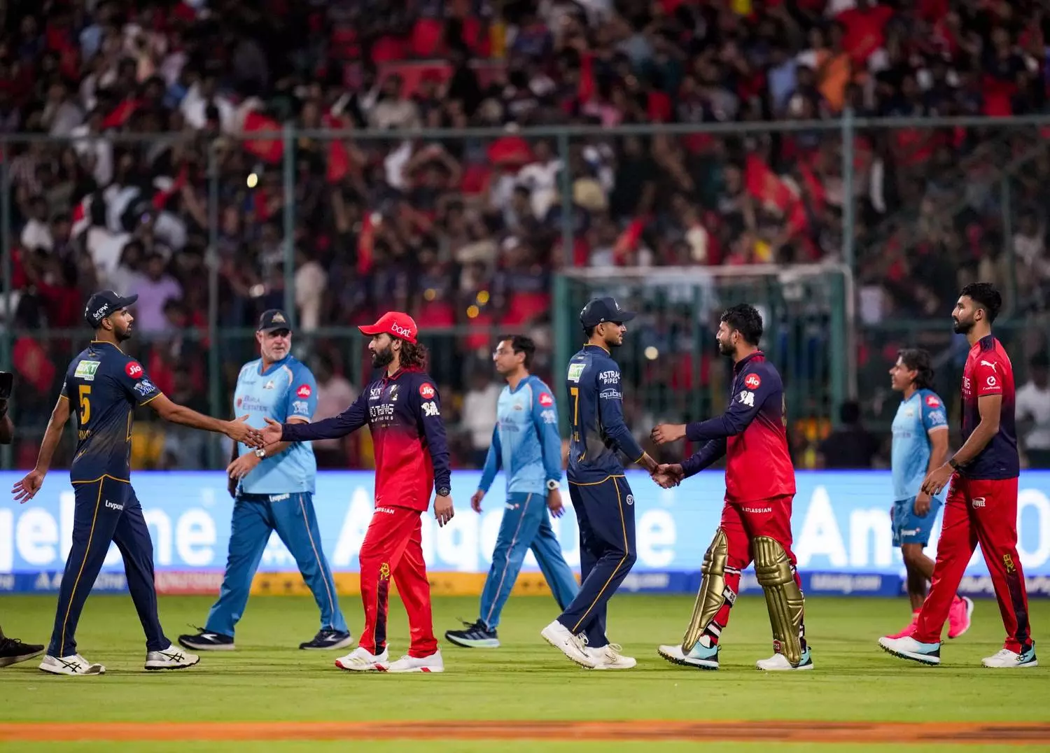 Gujarat Titans players congratulate Royal Challengers Bengaluru after RCB's victory at the M Chinnaswamy Stadium on Friday. PTI