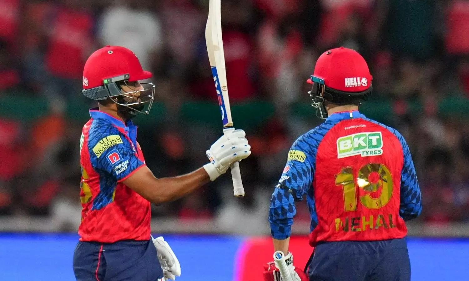 Punjab Kings' captain Shreyas Iyer, left, with Nehal Wadhera celebrates after his half century during their IPL 2026 match against Sunrisers Hyderabad, at MYS Cricket Stadium in Mullanpur, on Saturday, April 11. PTI