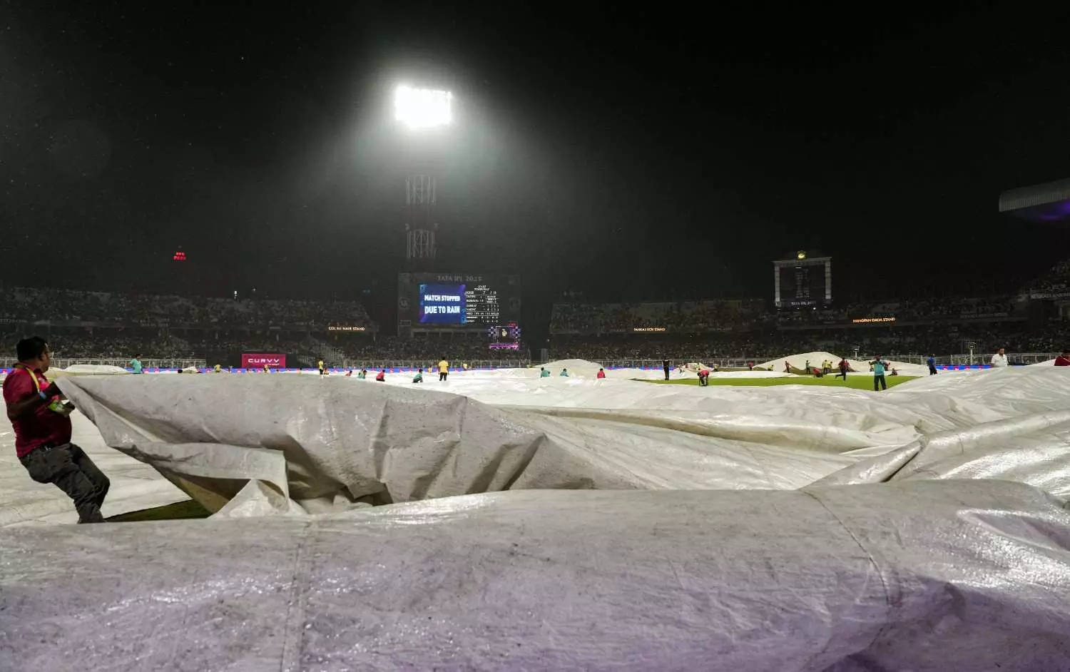 Ground staff covers the field after rain stopped play during an IPL 2025 match between Kolkata Knight Riders (KKR) and Punjab Kings (PBKS), at the Eden Gardens stadium, in Kolkata, Saturday, April 26. PTI