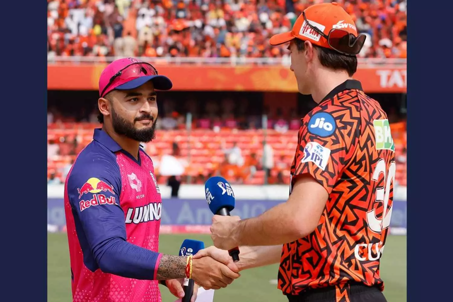 RR captain Riyan Parag (left) with SRH skipper Pat Cummins at the toss during Match 2 of IPL 2025 in Hyderabad on Sunday (March 23). Photo: X/@rajasthanroyals