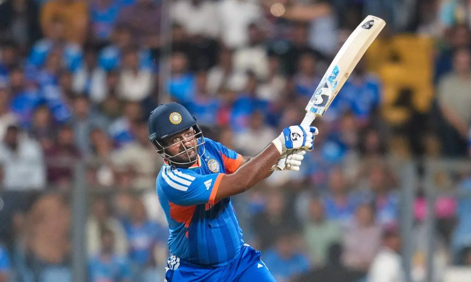 India's Sanju Samson plays a shot during the T20 World Cup second semi-final between India and England, at the Wankhede Stadium, in Mumbai, on Thursday, March 5. PTI