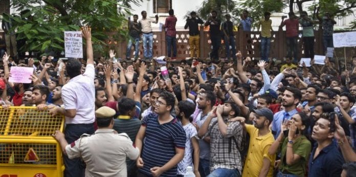 Students of the Institute of Chartered Accountants of India (ICAI) stage a protest outside its office near ITO over alleged improper eveluation of their answer sheets, in New Delhi. Photo: PTI File.